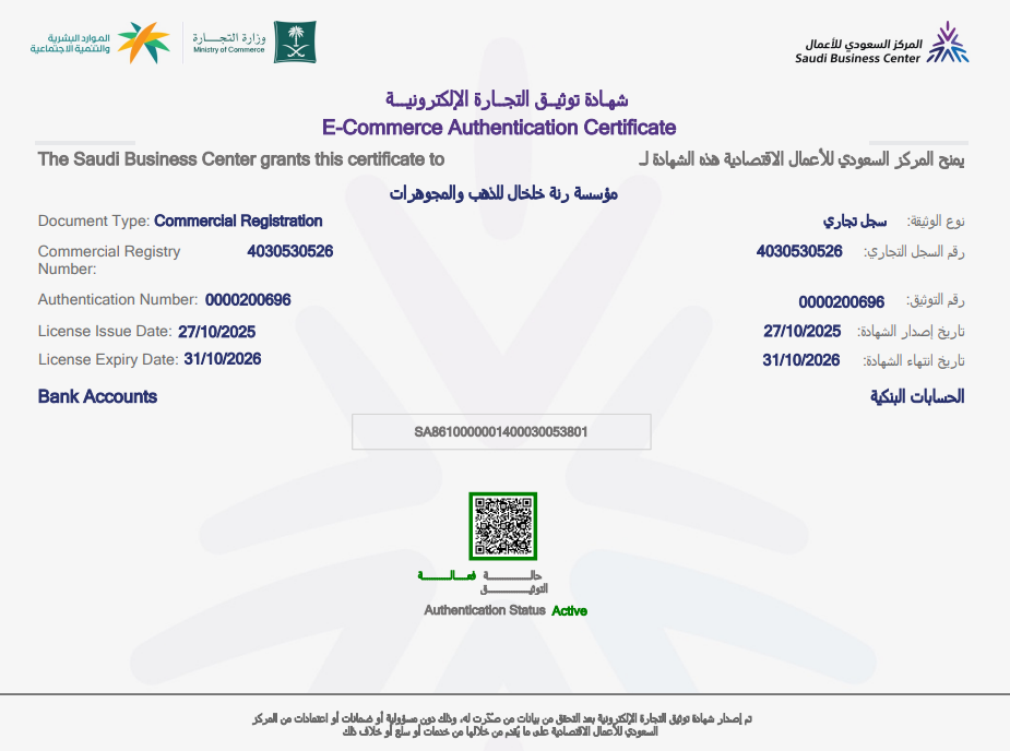 ينوّه متجر رنة خلخال للذهب والمجوهرات الإلكتروني بحصوله على شهادة توثيق التجارة الإلكترونية الصادرة عن وزارة التجارة في المملكة العربية السعودية، تأكيدًا على التزامه بمعايير الموثوقية وحفظ حقوق المستهلكين في بيئة التسوق الرقمي، وحرصه على تقديم تجربة تسوق آمنة وموثوقة لعملائه.